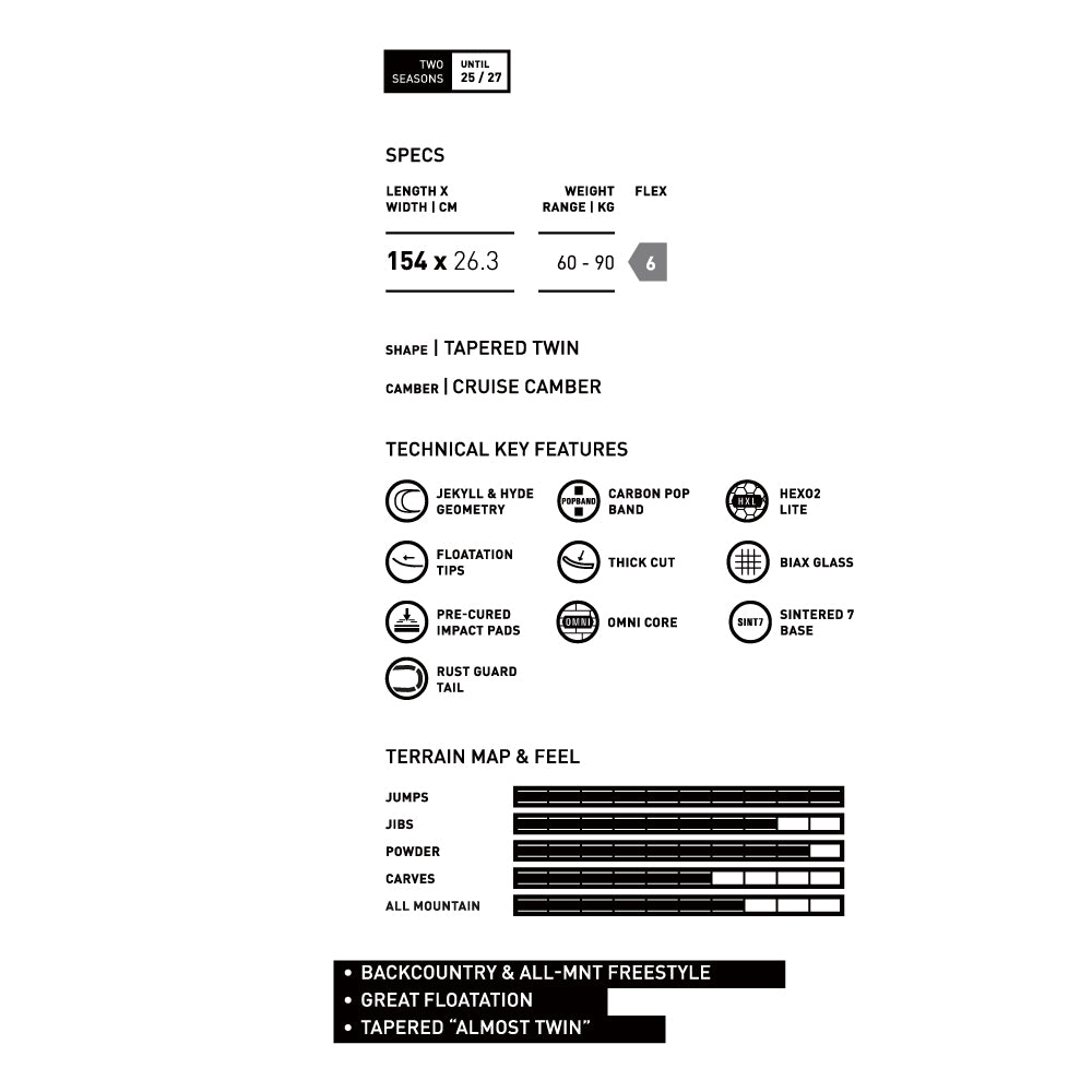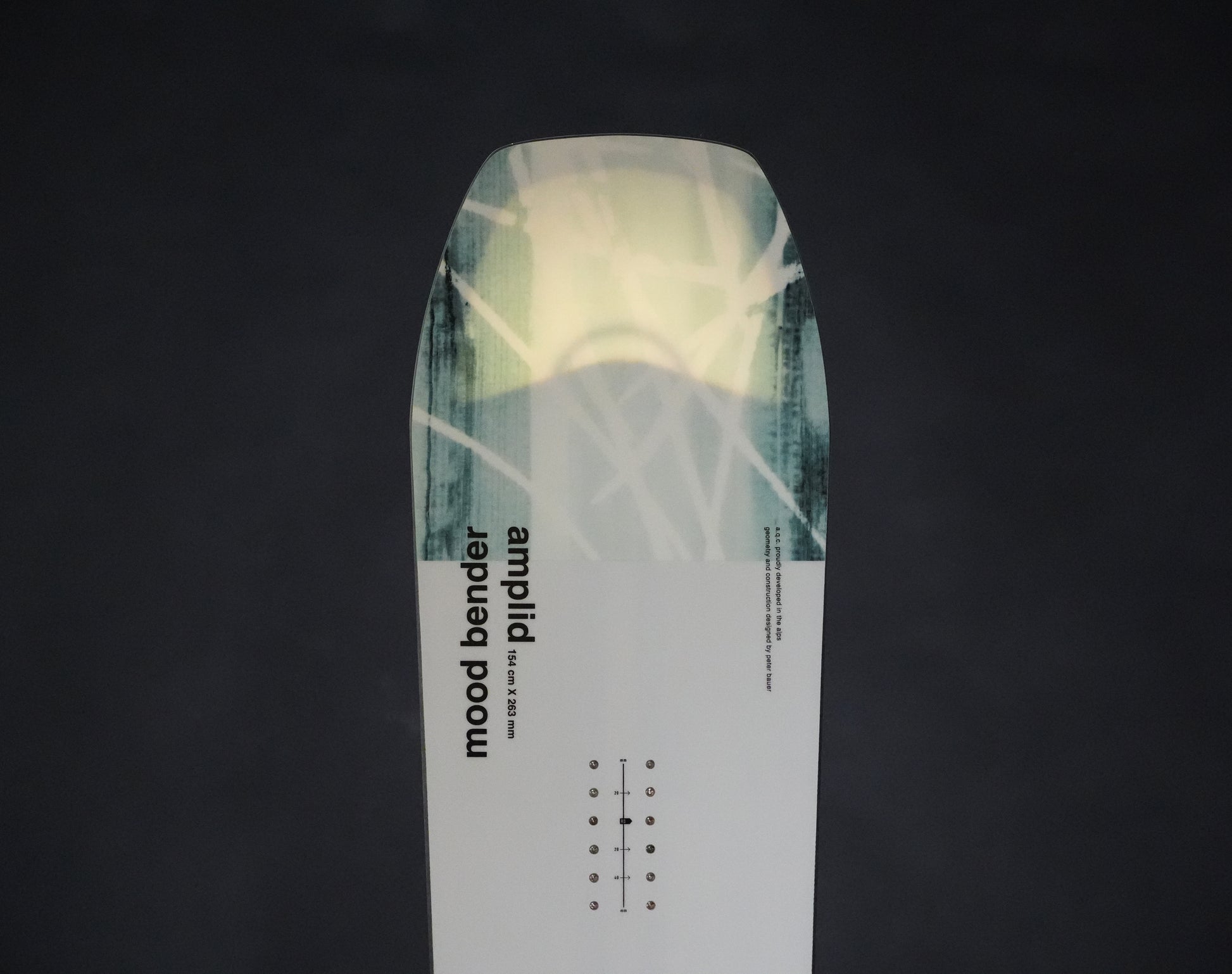 バックカントリーやサイドヒットに最適なフリースタイルボードとしてデザインされたMOODBENDERはややウェストに狭いほぼトゥルーツインシェイプ。洗練されたシェイプは俊敏性とコントロール性を両立し、ナチュラルヒット、パウダーラン、テクニカルな地形間のシームレスなトランジションに最適です。