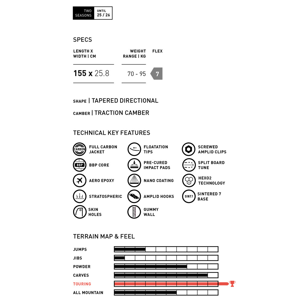 高い山のチャレンジをを征服するために考案され、テクニカルなバックカントリーの地形をナビゲートする AmplidのMetamorph は超軽量スプリットボードの新しい標準を確立します。コンパクトな形状で作られたこのボードは、最大限の上り坂の効率性、困難な高山探検と下山に重要なための重量とパフォーマンスの間の繊細なバランスを優先しています。先端とテールのサイズを最小限に抑え、戦略的に配置された接点により、Metamorph は非常に長い有効エッジを持ち、刻々と変化する高山のコンディションでも最大限のエッジパワーを保証します。その幾何学的な美しさはどこか奇妙なものと見たことのないものの間に位置するかもしれませんが、安心してください、この超軽量の驚異はあなたのバックカントリーツアーの経験を引き上げてくれるでしょう。