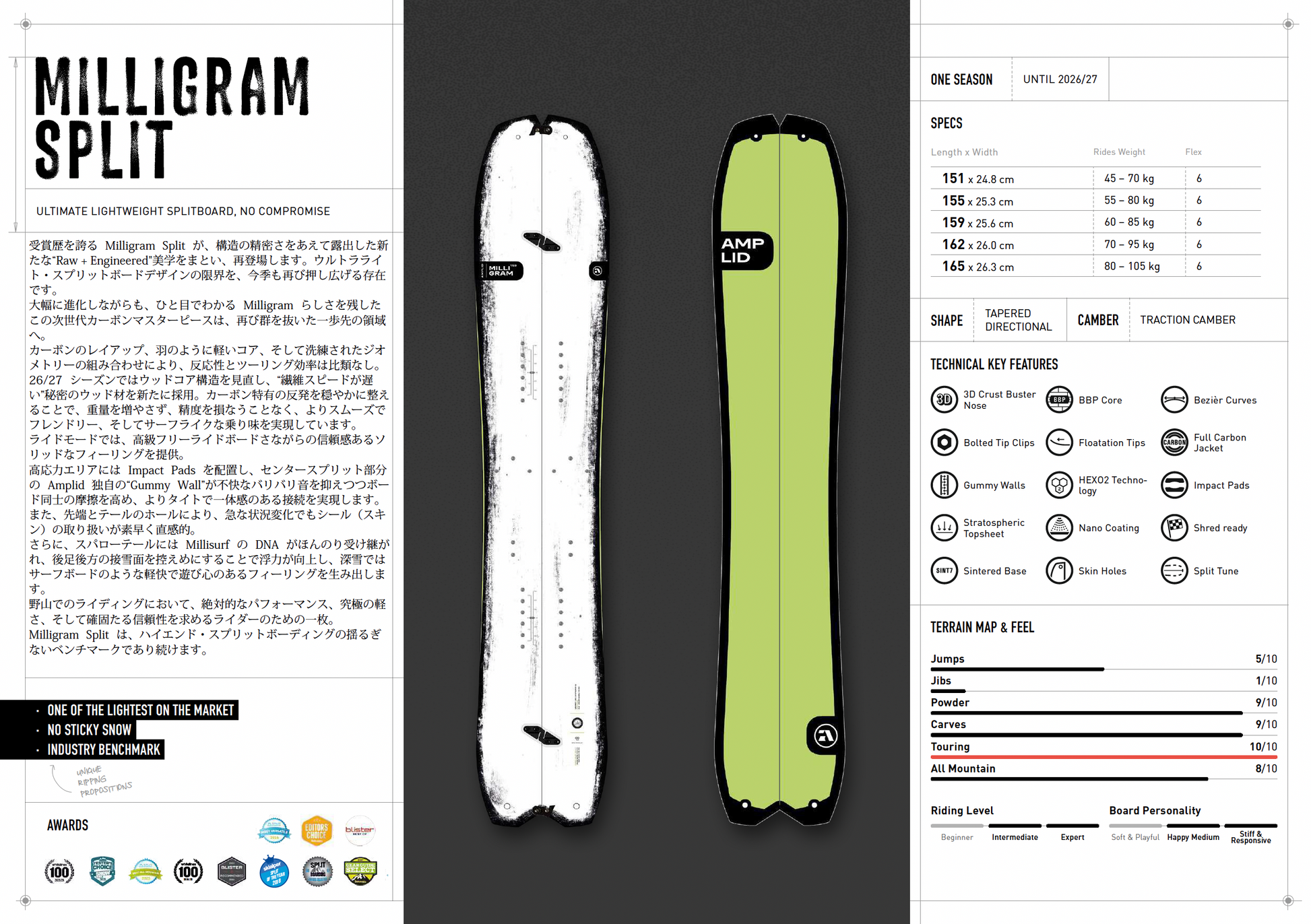 受賞歴を誇る Milligram Split が、構造の精密さをあえて露出した新たな“Raw + Engineered"美学をまとい、再登場します。ウルトラライト・スプリットボードデザインの限界を、今季も再び押し広げる存在です。大幅に進化しながらも、ひと目でわかる Milligram らしさを残したこの次世代カーボンマスターピースは、再び群を抜いた一歩先の領域へ。カーボンのレイアップ、羽のように軽いコア、そして洗練されたジオメトリーの組み合わせにより、反応性とツーリング効率は比類なし。26/27 シーズンではウッドコア構造を見直し、“繊維スピードが遅い”秘密のウッド材を新たに採用。カーボン特有の反発を穏やかに整えることで、重量を増やさず、精度を損なうことなく、よりスムーズでフレンドリー、そしてサーフライクな乗り味を実現しています。ライドモードでは、高級フリーライドボードさながらの信頼感あるソリッドなフィーリングを提供。高応力エリアには Impact Pads を配置し、センタースプリット部分の Amplid 独自の“Gummy Wall”が不快なバリバリ音を抑えつつボード同士の摩擦を高め、よりタイトで一体感のある接続を実現します。また、先端とテールのホールにより、急な状況変化でもシール(スキン)の取り扱いが素早く直感的。さらに、スパローテールには Millisurf の DNA がほんのり受け継がれ、後足後方の接雪面を控えめにすることで浮力が向上し、深雪ではサーフボードのような軽快で遊び心のあるフィーリングを生み出します。野山でのライディングにおいて、絶対的なパフォーマンス、究極の軽さ、そして確固たる信頼性を求めるライダーのための一枚。Milligram Split は、ハイエンド・スプリットボーディングの揺るぎないベンチマークであり続けます。