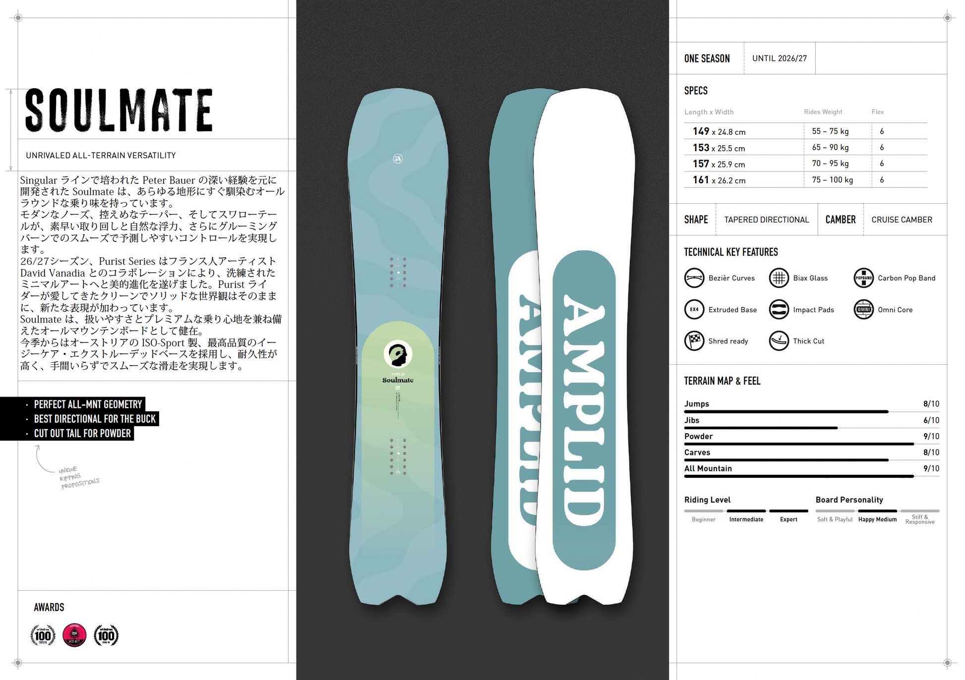 Singular ラインで培われた Peter Bauer の深い経験を元に開発された Soulmate は、あらゆる地形にすぐ馴染むオールラウンドな乗り味を持っています。モダンなノーズ、控えめなテーパー、そしてスワローテールが、素早い取り回しと自然な浮力、さらにグルーミングバーンでのスムーズで予測しやすいコントロールを実現します。26/27シーズン、Purist Series はフランス人アーティストDavid Vanadia とのコラボレーションにより、洗練されたミニマルアートへと美的進化を遂げました。Purist ライダーが愛してきたクリーンでソリッドな世界観はそのままに、新たな表現が加わっています。Soulmate は、扱いやすさとプレミアムな乗り心地を兼ね備えたオールマウンテンボードとして健在。今季からはオーストリアの ISO-Sport 製、最高品質のイージーケア・エクストルーデッドベースを採用し、耐久性が高く、手間いらずでスムーズな滑走を実現します。